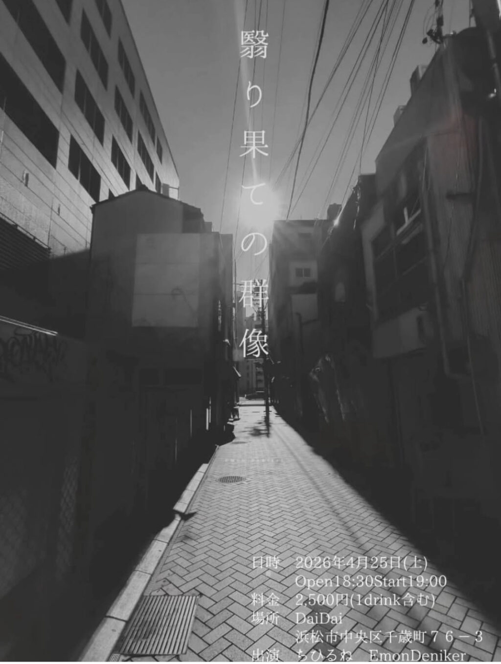 観覧者募集中 翳り果ての群像 2時間 ago satoshi nakada 2026/4/25(土)Open 18:30Start 19:002500円(1drink込み) 出演ちひるねEmonDeniker Tags: bar, emondeniker, LIVE, music, お酒, だいだい, ちひるね, モール街, ライブ, 浜松, 浜松市 Continue Reading Previous 3人のうた vol.9 More Stories 観覧者募集中 3人のうた vol.9 2時間 ago satoshi nakada 観覧者募集中 森一馬LIVE in HAMAMATSU 2時間 ago satoshi nakada 観覧者募集中 下山武徳的夜会 静岡ツアー2026 2時間 ago satoshi nakada